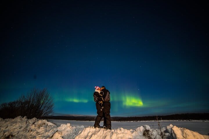 At night, near 20h00 (8 pm), you'll be picked up again and head to a secluded spot, surrounded by the forest and near a frozen Arctic lake, where your instructor will build a fire inside a traditional Kota. You'll search for the Northern Lights in the dark, then head inside to warm up and grill delicious sausages and marshmallows, accompanied by hot berry juice. You'll return to your accommodations with incredible memories (and photos) of a triple activity in Finnish Lapland.