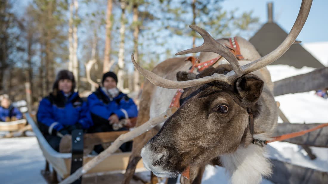 Adéntrese en la noche ártica y deje que unos adorables animales bien adiestrados le guíen por la naturaleza lapona en un paseo nocturno en trineo tirado por renos desde Rovaniemi.