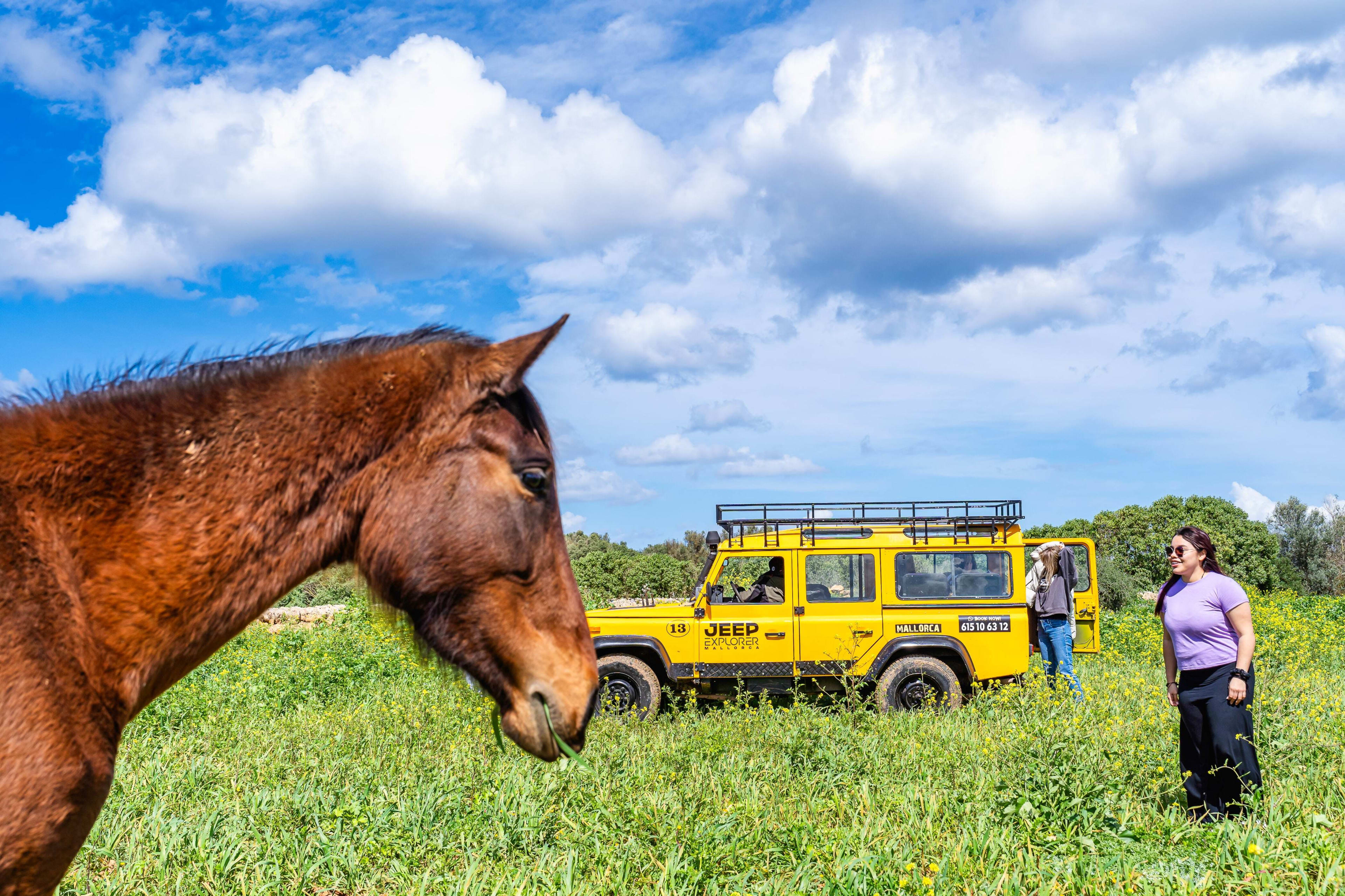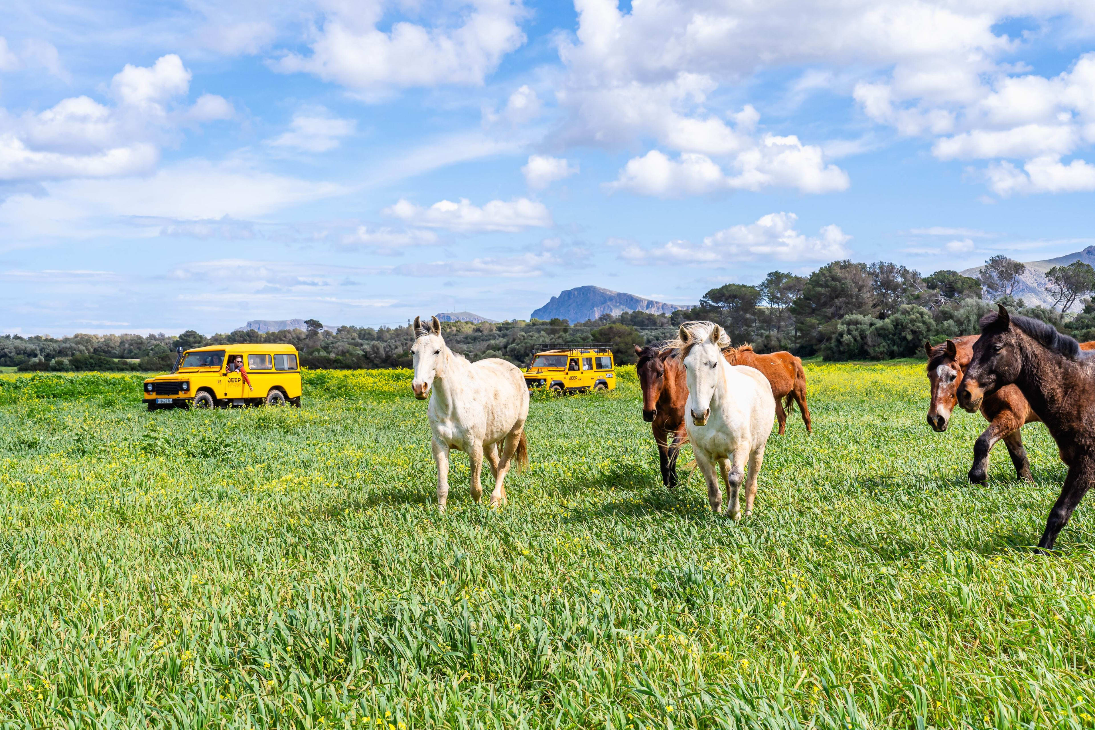 A bord d'une jeep, vous partirez pour une excursion de 2 heures pendant laquelle vous profiterez d'une découverte guidée des terres privées du Rancho Grande Park où se trouvent des animaux locaux dans leur habitat naturel, puis d'une pause détente et baignade au bord d'une plage à Son Serra de Marina.