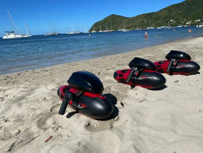 L'excursion commence par une prise en main intuitive de votre scooter électrique Sublue Vapor sur la plage de sable blanc. Après un briefing complet sur la sécurité et le maniement de l'appareil, vous glissez dans l'eau pour un parcours commenté le long de la côte sud. Le moteur silencieux vous propulse vers trois sites emblématiques : la Pointe Lézarde, la mystérieuse Grotte aux couleurs et l'incontournable Pointe Burgos. Grâce à la vitesse du scooter, vous couvrez une distance importante, multipliant ainsi vos chances de croiser les célèbres tortues marines qui peuplent la baie de Grande Anse.